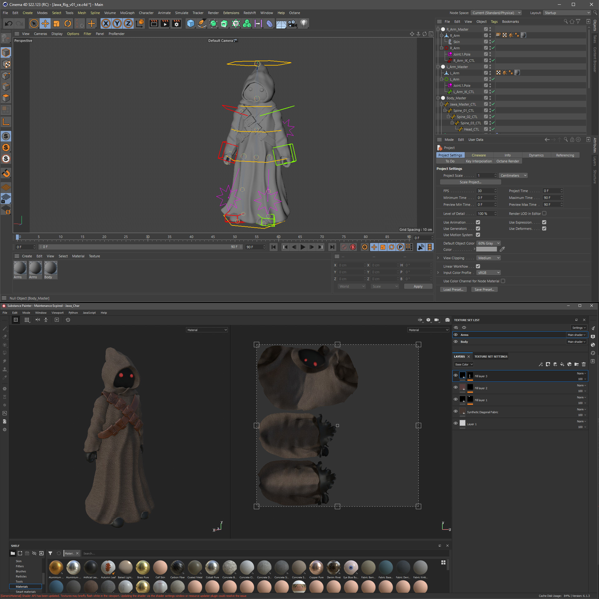 For the Jawa, Robert found a great model for 3D Printing. I had to think of a way so we can actually deform the triangular mess of a mesh. I seperated the arms and rigged the body as good as possible. Later I added textures using Substance Painter.